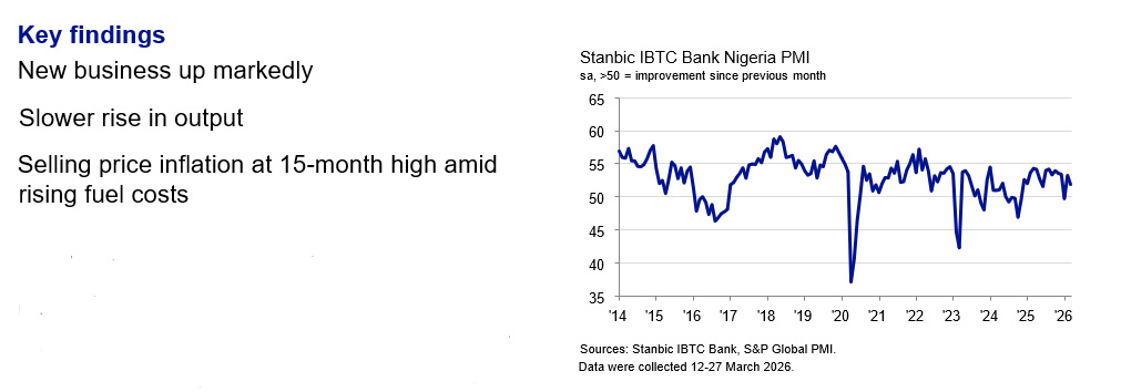 Growth slowed in the Nigerian private sector at the end of the first quarter of the year as higher fuel costs led to a steep intensification of inflationary pressures. Output growth was only modest, but underlying demand reportedly remained resilient, leading to a further sharp rise in new orders. In turn, firms continued to expand their employment and purchasing activity.